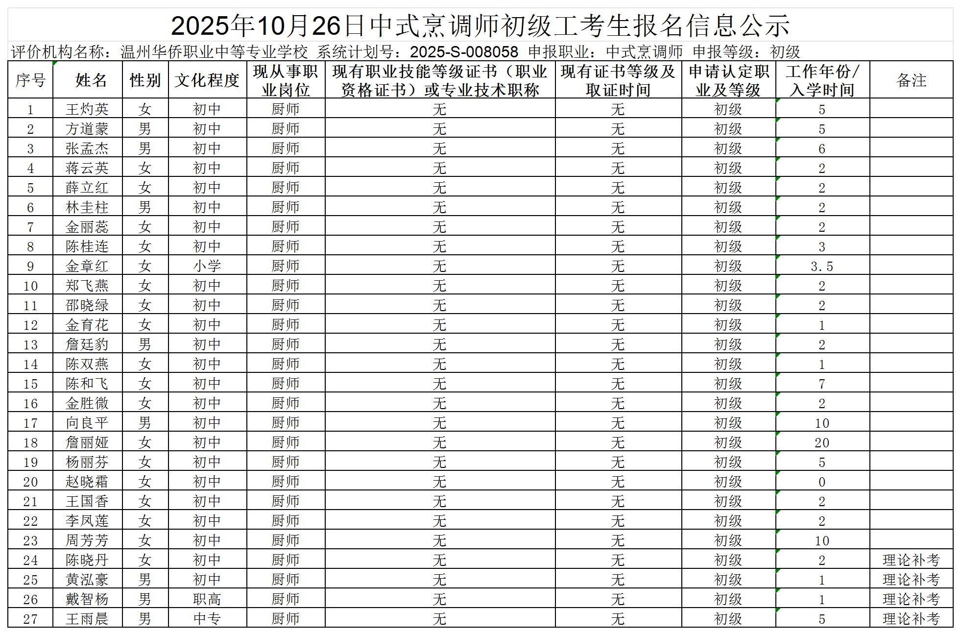 现公示2025年10月26日中式烹调师初级工社会考生报名情况,如有异议请联系我校社会服务处公开监督电话0577——56698210或温州市技能人才评价管理服务中心0577——88111377
