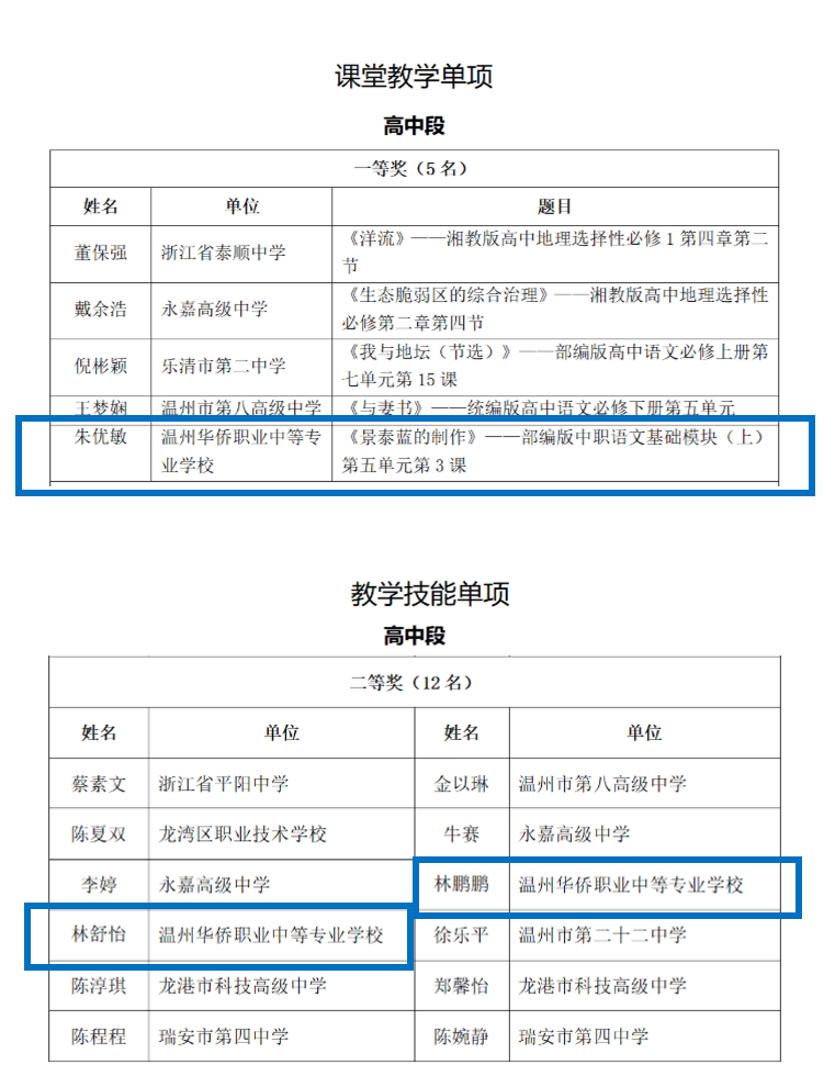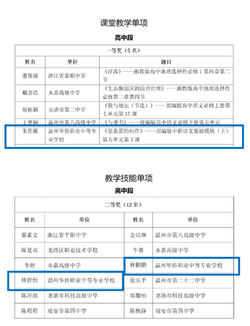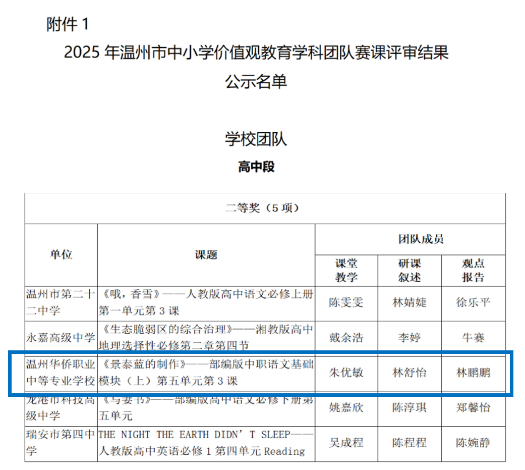 近日,2025年温州市中小学价值观教育学科团队赛课评审活动结果正式揭晓,温州华侨职业中等专业学校朱优敏、林舒怡、林鹏鹏三位老师凭借极为精彩且引人入胜的教学展示、扎实稳健的教学技能、创新独特的教学设计,荣获团队综合评审二等奖。朱优敏老师荣获课堂教学一等奖,林舒怡和林鹏鹏两位老师荣获教学技能二等奖。