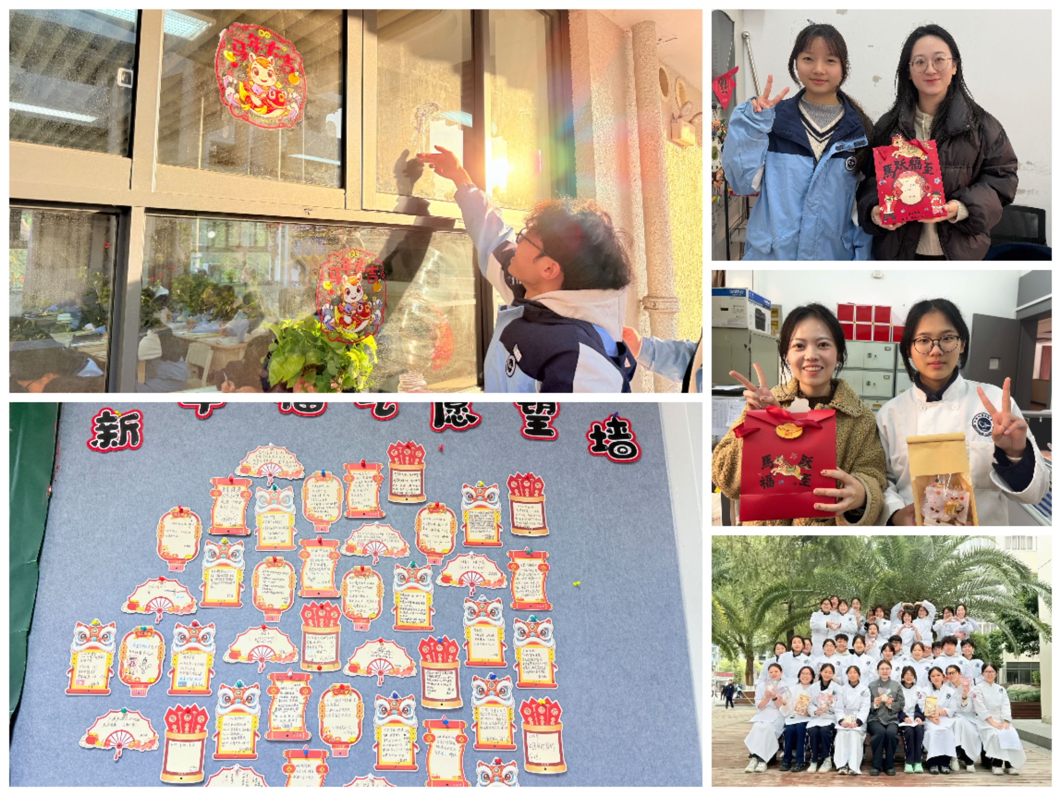 24中西面点班级集聚实训室,化身巧手匠人,共同制作精心制作雪花酥、养生馒头、香甜牛轧糖饼干,将这份饱含心意的美味回馈辛苦一年的师长和班级家委们。班会课结束后,同学们一起贴窗花,用红灯笼点缀绿植,一抹抹喜庆的红,将迎接新年的热切氛围。