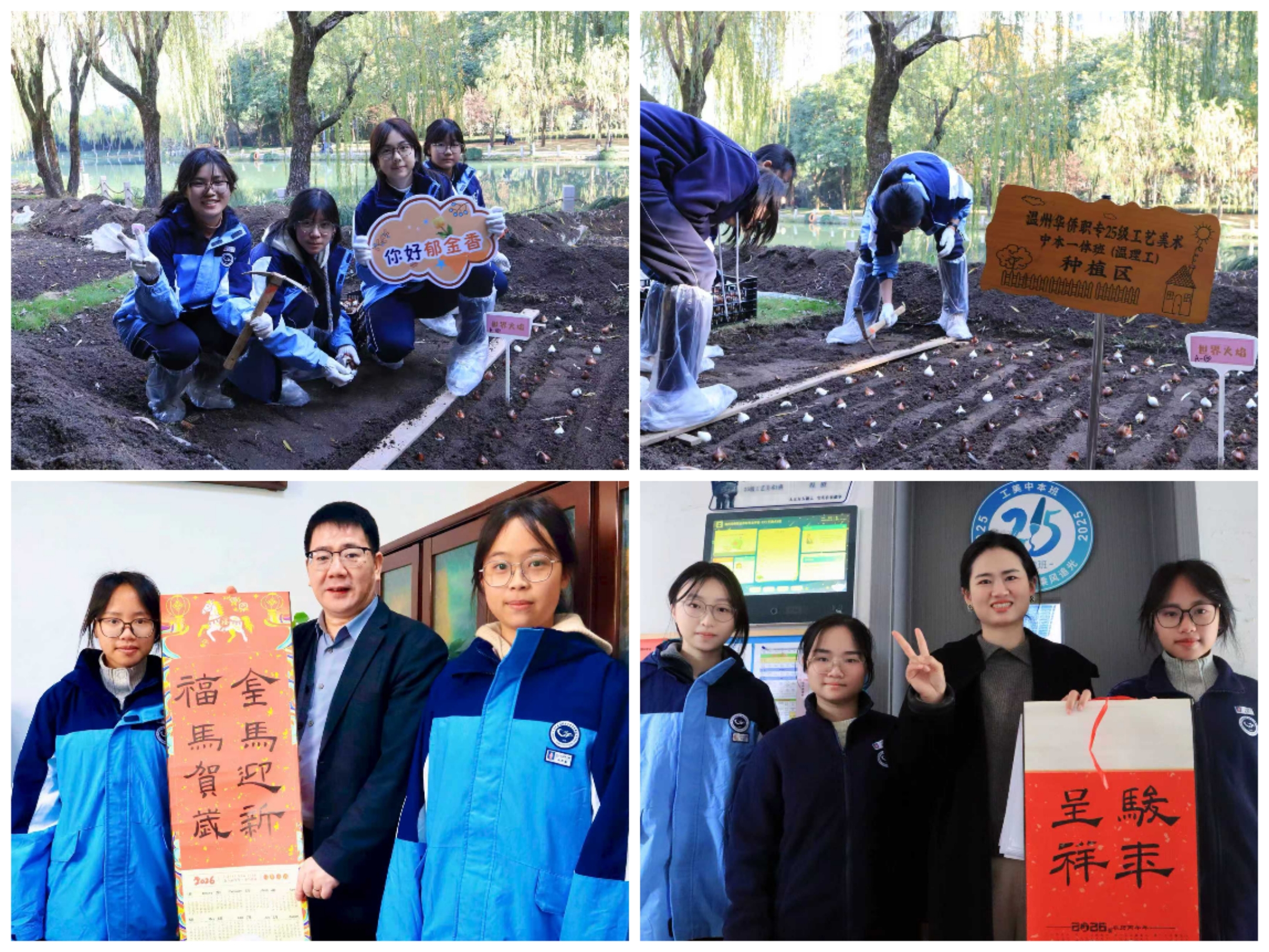 新年来临之际,25工美1班同学们发挥书法特长,开展了“笔墨书祝福,日历赠恩师”特色新年活动,同学们以端庄古雅的隶书书写马年新年祝福,将一份份饱含温度的祝福送到学校老师手中,用传统笔墨传递新年心意。同时25工美1的同学们还开展了“郁见园博、共植春天”郁金香种植特色活动,在实践中感悟自然之美与责任担当。大家分工协作,挖坑、放种球、覆土、整理,每一个步骤都认真而专注。感悟“播种—等待—绽放”的成长规律,把对新一年的期待也悄悄埋进土壤。