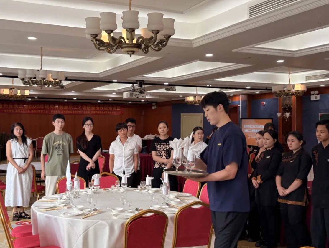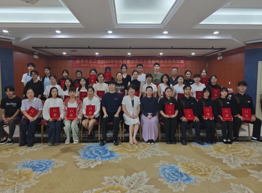 9月20日,温州市总工会2025年转岗再就业职工之饭店服务技能(中西点烹饪、餐饮服务、前厅客房服务)培训班在温州华侨职专成功举办。此次培训班由市总工会、市财贸工会主办,温州市饭店餐饮烹饪行业协会、温州华侨职专、温州市甘佩蓓技能大师工作室承办,旨在为有转岗再就业需求的职工点亮技能提升新路径,推动温州饭店餐饮行业高质量发展。本次培训共吸引123 名有转岗再就业需求人员全程参与,为其后续稳定就业筑牢技能基础。