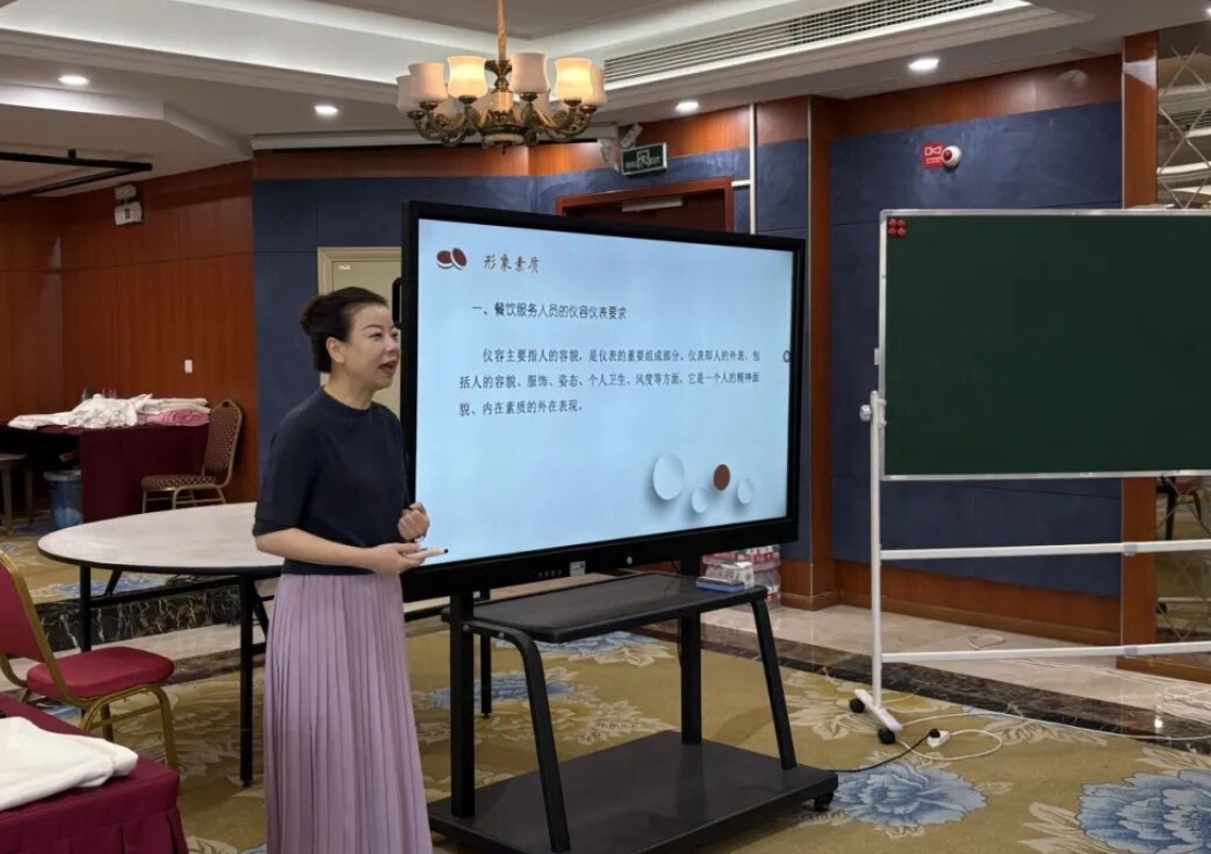 甘佩蓓老师的餐饮服务讲解专业细致、条理清晰,她详细解读了餐饮服务岗位实操标准的各项指标和要求 —— 从口布折花的造型完整度、中餐摆台的餐具间距精度,到侍酒服务的倒酒规范、分菜上菜的分量均匀度,让学员们对餐饮服务的标准化流程有了更准确、更深入的理解。同时,采用 “分组成果验收” 的模式,将 42 名学员划分为四个小组通过对口布折花捏褶力度、中餐摆台定位手法等核心服务技能的现场示范和分步讲解,让学员在协作与实践中深化技能掌握,也方便学员间互帮互助。
