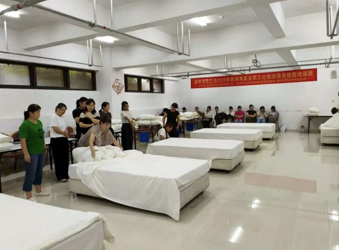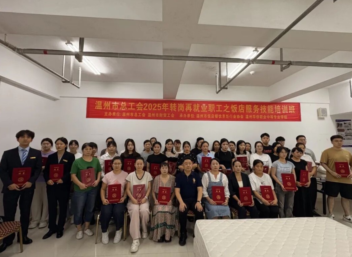 9月20日,温州市总工会2025年转岗再就业职工之饭店服务技能(中西点烹饪、餐饮服务、前厅客房服务)培训班在温州华侨职专成功举办。此次培训班由市总工会、市财贸工会主办,温州市饭店餐饮烹饪行业协会、温州华侨职专、温州市甘佩蓓技能大师工作室承办,旨在为有转岗再就业需求的职工点亮技能提升新路径,推动温州饭店餐饮行业高质量发展。本次培训共吸引123 名有转岗再就业需求人员全程参与,为其后续稳定就业筑牢技能基础。