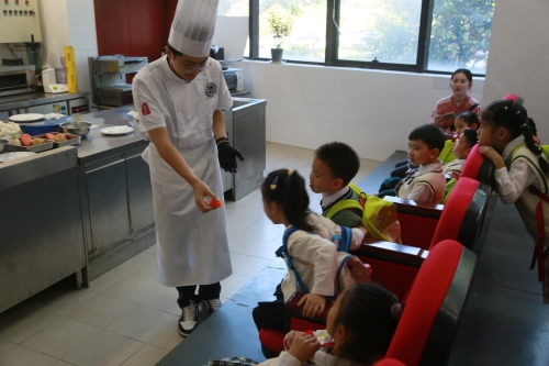 烹饪教研组杜伟川、王大勇老师参加活动,王大勇老师带领小朋友进行了点心制作体验。