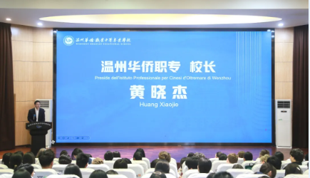 仪式上,温州华侨职专校长黄晓杰致欢迎辞。他代表全校师生对意大利师生表示热烈欢迎,回顾两校去年友好互访结下的深厚情谊,介绍学校69年侨特色办学底蕴与国际化育人成果。他表示,未来10天,意大利师生将沉浸式体验瓯塑、瓯菜、餐巾折花、中式茶艺、舞龙舞狮等非遗文化与特色技能,在交流互鉴中感受中国魅力、增进中意友谊。